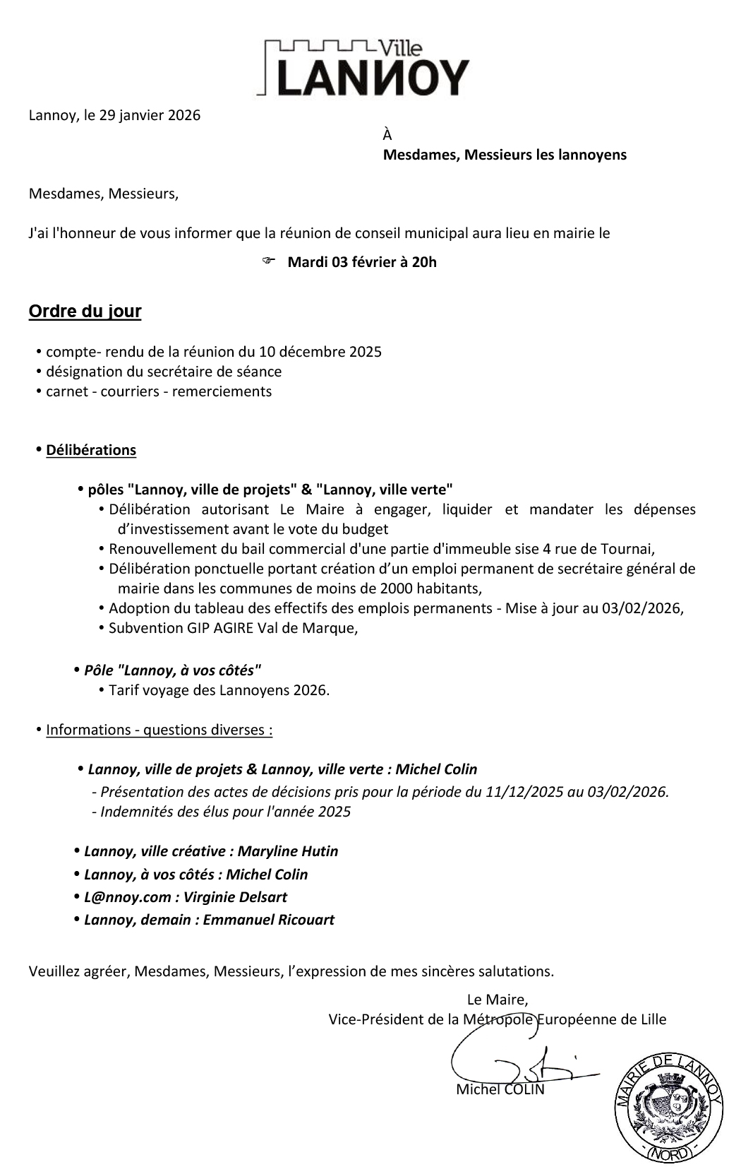 ODJ : conseil municipal du mardi 3 février 2026